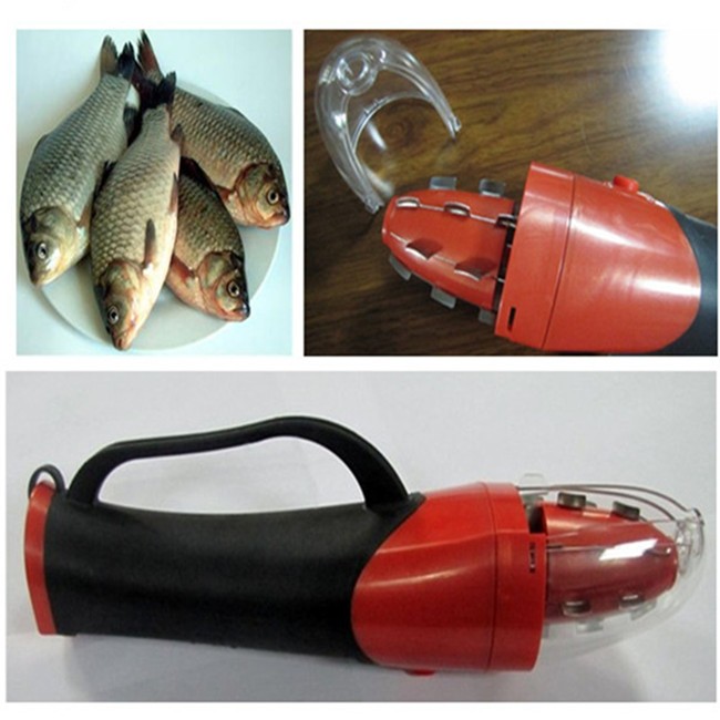Portable professional fish scaler, composed by handle, two transparent covers, blade head , and adaptor. The soft-rubber injection handle works comfortable and abti-slip.