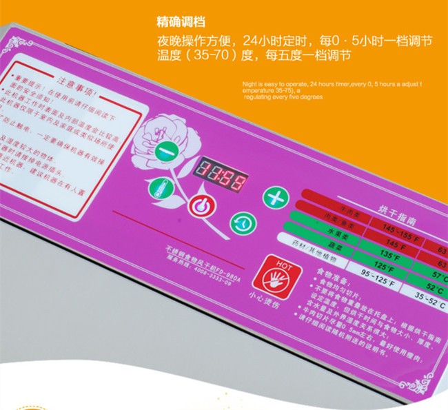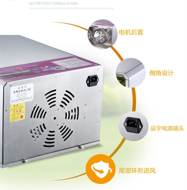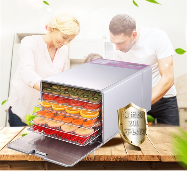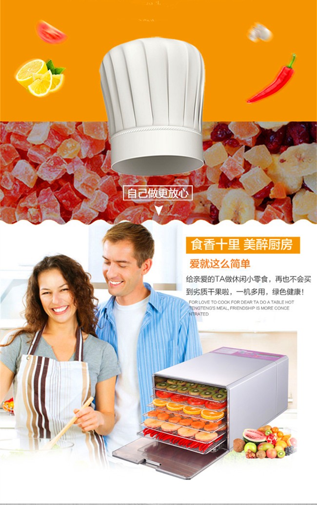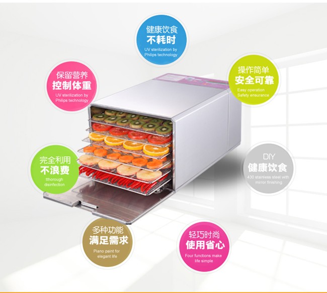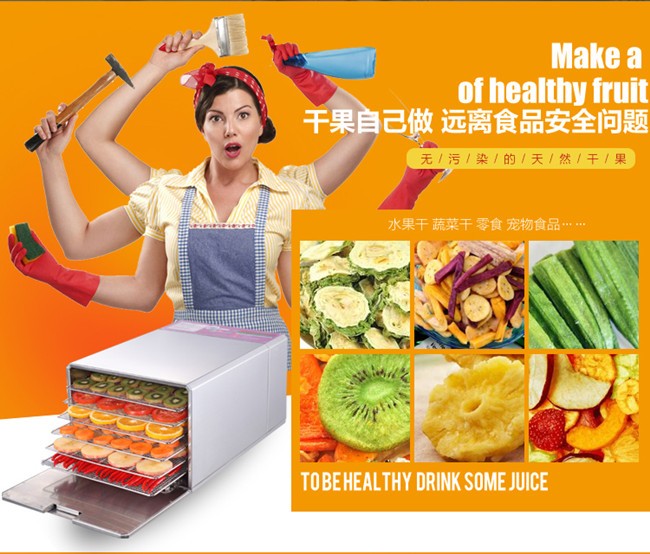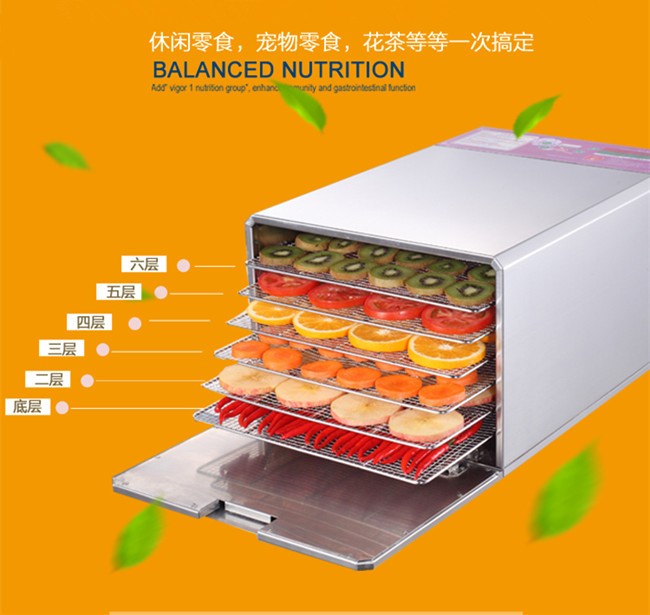 Small industrial dryer (household),The whole machine is made from stainless steel material,All edges polished smooth round.In strict accordance with the European Union electric appliance production standards, the use of nickel chrome fever wire, aluminum alloy blades,Life can be up to 30 years,Products through the CE and GS certification.Range of application:Fruits, plants, herbs, meat and other products of dehydration and drying.
